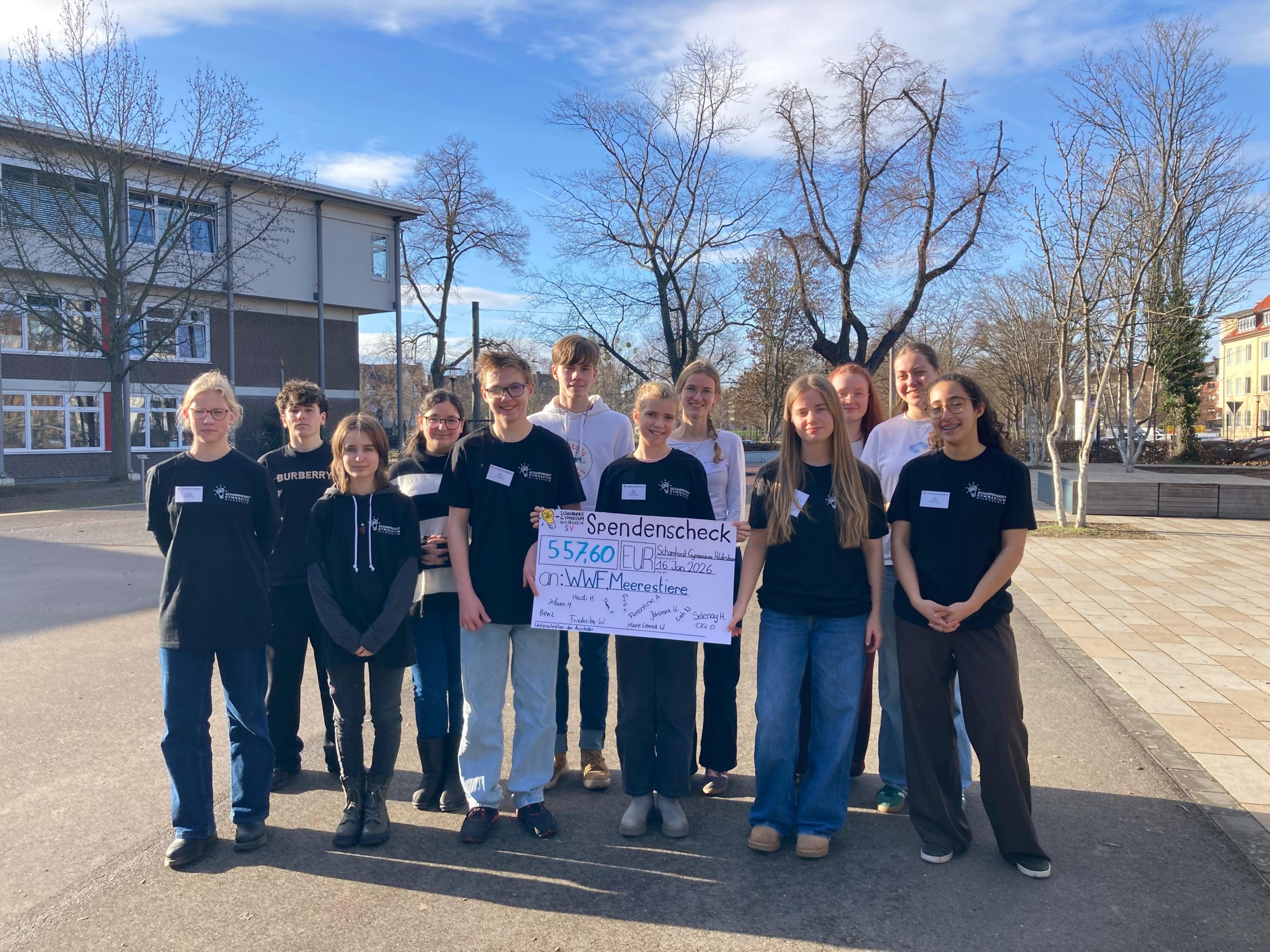 Gegen eine Spende von 2€ durfte die Schulgemeinschaft im Dezember täglich ihr Glück am Glücksrad in der Pausenhalle versuchen und dabei entweder einen kleinen, mittleren oder großen Schokoweihnachtsmann gewinnen. Parallel sorgten Weihnachtsmusik und Dekorationen für eine feierliche Stimmung. Zu unserer großen Freude wurde die dreiwöchige Aktion sehr gut angenommen und wir konnten unfassbare 557, 60 € einnehmen, die nun von der Schulleitung an WWF überwiesen werden und damit vor allen Dingen dem Meeresschutz zugute kommen.